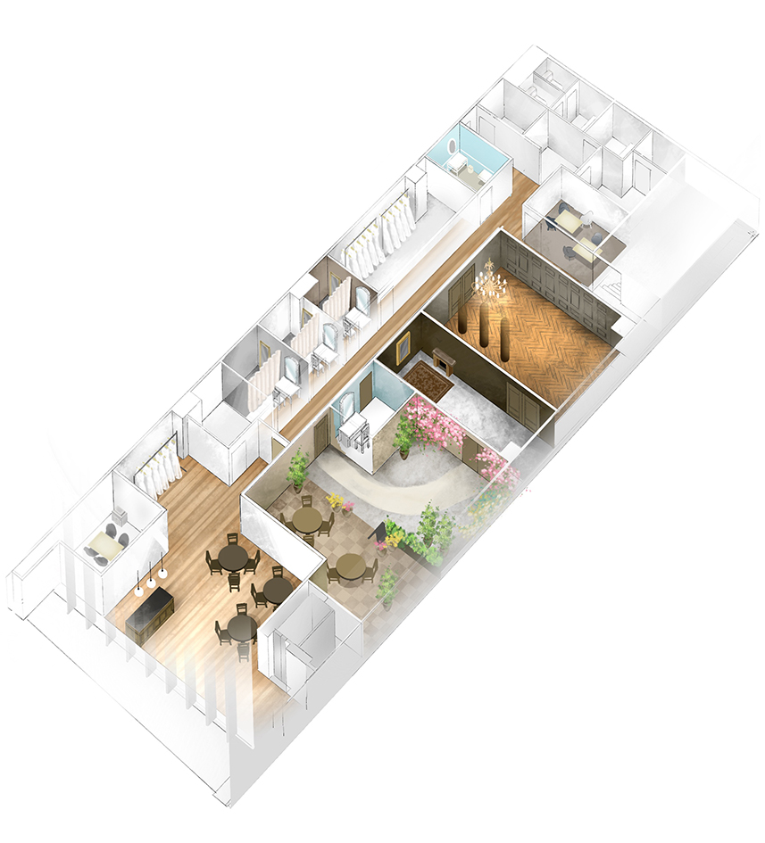 光の入り方、照明の当て方、カメラのポジション、それぞれの位置を想定したゾーニングはもちろん、ブランドイメージを反映した「どこで撮っても映える空間」を設計段階から丁寧にデザインします。